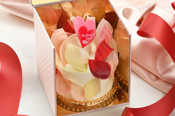 可愛らしい花びら型のフランス産ヴァローナ社チョコレートをパティシエが一枚一枚丁寧に飾り付け、エレガントなケーキに仕上げました。