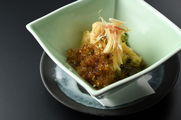 【強 肴】 揚げ穴子と胡瓜の青海苔土佐酢ジュレ掛け 千切花茗荷